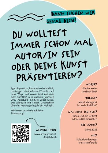 Das Jahrbuch "Unser Kreis 2027" hat den Titel: "Kunstvoll - Ein Kreis voller Kunst". Du als junger Autor möchtest Teil davon sein und uns deinen Lieblingsort im Kreis Steinfurt beschreiben? Das ist super. Damit die Redaktion besser planen kann, teile das Thema bitte der zuständigen Redakteurin, Angelika von Dewitz-Krebs, bis zum 30.01.2026 mit.