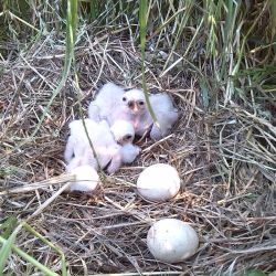 Brutperiode: Ab April Gelege: 4-5 Eier möglich; Legeabstand 1-2 Tage Eier: Länge ca. 5-6 cm; Form rundlich; Färbung bläulich-weiß. Brutdauer: 31-36 Tage (Schlupf erfolgt zeitversetzt) Küken: weiße, vgl. große Nesthocker; Flügge/selbstständig nach ca. 50-60 Tagen | Rohrweihen-Nest in Wintergerste (Foto: Biologische Station Steinfurt) |