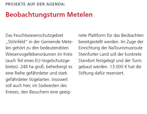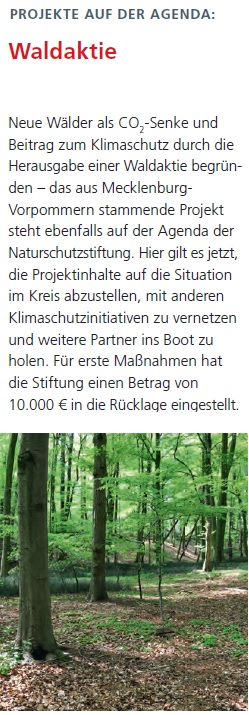 In den zurück liegenden Jahren wurden insgesamt 550.000 € in die Projektförderung bzw. in entsprechende Rücklagen eingestellt. Durch eine Ko-Finanzierung im Rahmen anderer Förderprogramme konnten weitere 200.000 € für Naturschutzprojekte gewonnen werden.