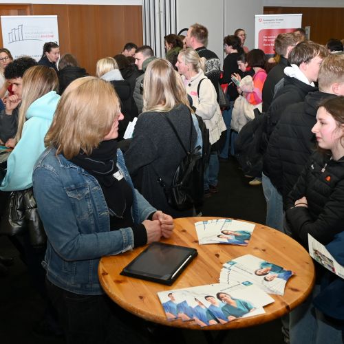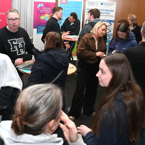 Im Anschluss an das Bühnenprogramm standen zahlreiche Infostände von Partnern zur Verfügung, die über den Übergang zwischen Schule und Beruf informieren. Jugendliche und Eltern hatten die Möglichkeit, individuelle Fragen zu klären und erste Kontakte zu knüpfen – unter anderem mit der Agentur für Arbeit, der FH Münster, der Universität Münster, der Kreishandwerkerschaft Steinfurt Warendorf, der Handwerkskammer Münster, der IHK Nord Westfalen, regionalen Berufskollegs sowie weiteren Bildungs- und Ausbildungspartnern.