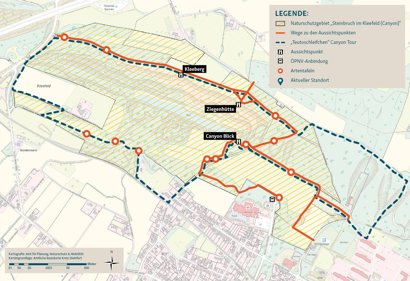 - Teutoschleifchen "Canyon-Tour": Dieser Wanderweg mit 5,3 km startet an der Karpelle am Hortensia Garden und führt durch das NSG "Steinbruch am Kleefeld" und um den Canyon.