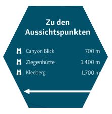 Diese Übersichtskarte finden Sie auf den vier „Eingangstafeln“ nahe der Parkplätze (jeweils aktueller Standort). Die orangefarbenen Wege führen Sie auf dem Kürzesten Weg zum nächsten Aussichtspunkt. Auf den Wegweiser-Schildern befinden sich auch Angaben zur Länge der Wegstrecke.