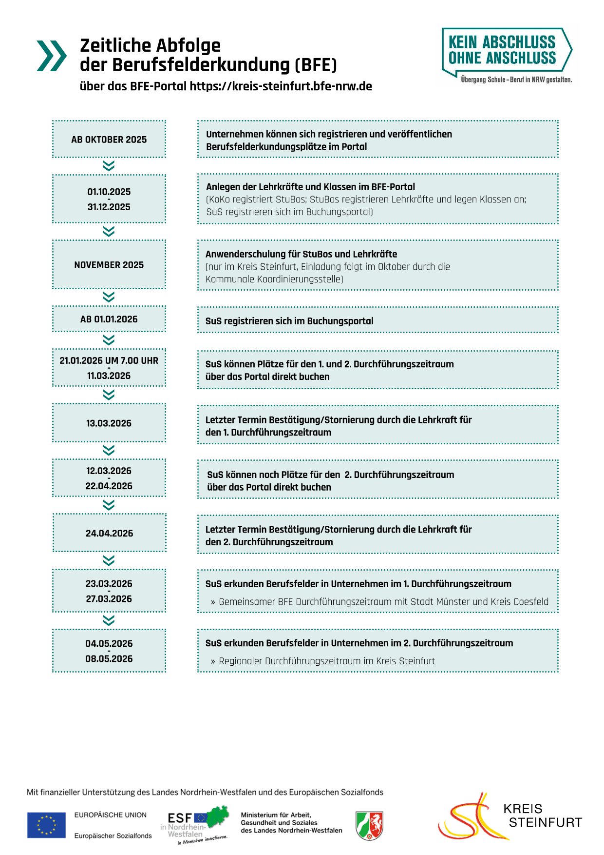 Die Zeiträume für die Berufsfelderkundungstage zur Nutzung des BFE-Portals für das Schuljahr 2025/26 im Kreis Steinfurt sind: