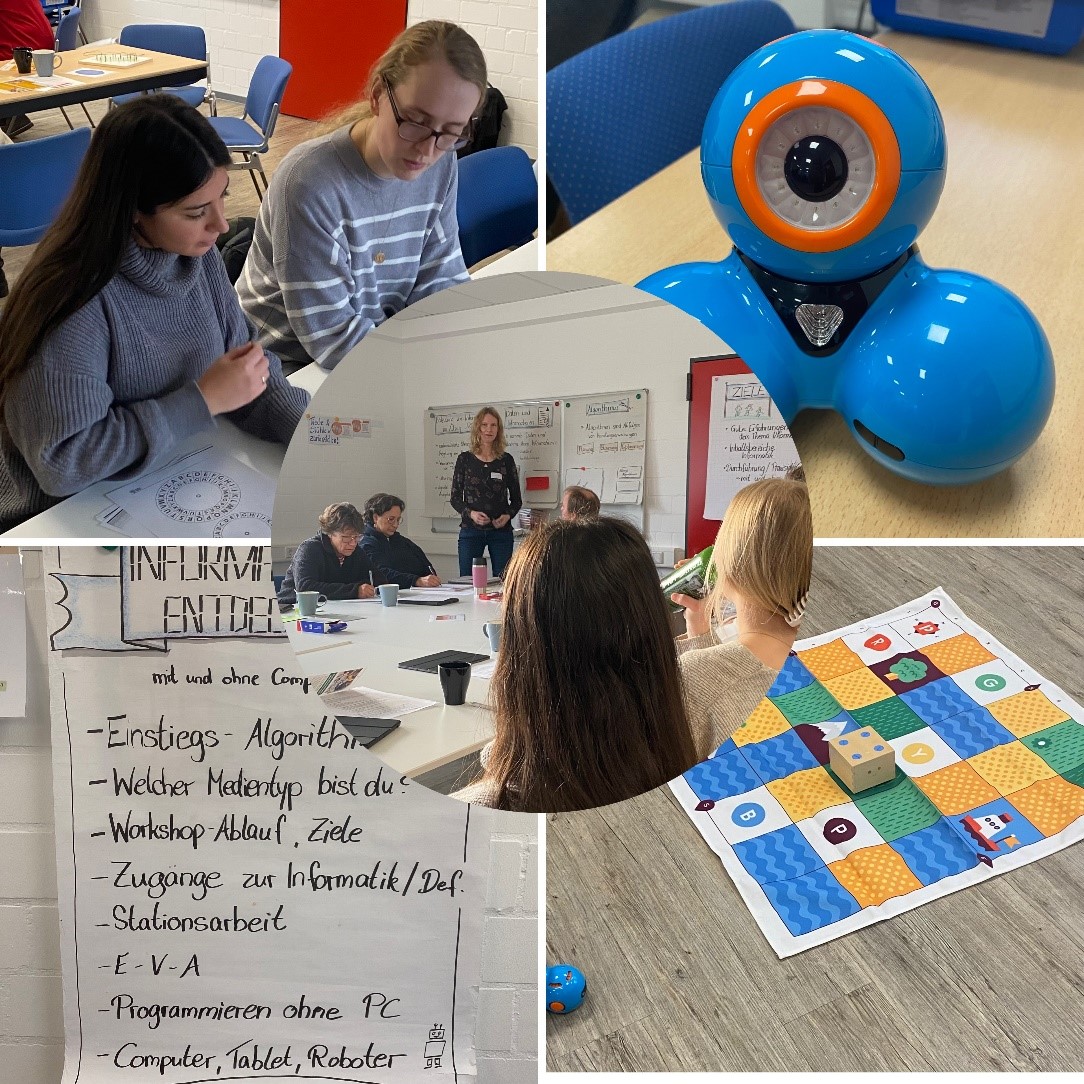 Im Workshop zum Thema „Informatik entdecken“ stand die Einführung in algorithmisches Denken im Vordergrund. Die Teilnehmenden lernten, wie sie Grundschülerinnen und Grundschüler auf spielerische Weise an die Grundlagen der Programmierung heranführen können. Mithilfe von einfachen Materialien wie Spielfeldern konnten die Lehrkräfte erleben, wie Sequenzen oder Bedingungen altersgerecht vermittelt werden können. Die Lehrkräfte erprobten einfache Coding-Roboter aus Holz (Cubettos) selbst. Danach waren die Lehrkräfte bereit für ihre ersten Erfahrungen im Umgang mit Dash-Robotern und Ozobots. Sie erhielten dabei fachkundige Hilfestellung durch die Trainerin Barbara Schulze-Mastrup. Eine Teilnehmerin kommentierte abschließend: „Das hat richtig Spaß gemacht. Nun traue ich mich an das Thema Informatik heran.“