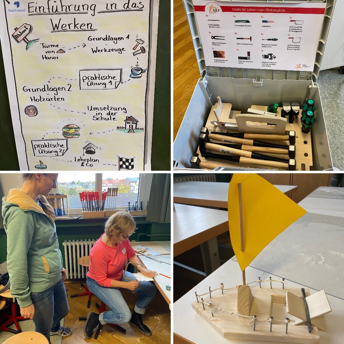 Bei dem Workshop „Werken mit Holz“ wurde erfahrbar, wie der Werkstoff Holz im Sachunterricht oder in anderen kreativen Projekten eingesetzt werden kann. Unter Anleitung von Michael Wittwer und Anne Kothe erlernten die Lehrkräfte grundlegende Techniken des Holzwerkens und setzten kleine praxisorientierte Projekte um, die Schülerinnen und Schüler später in ihrer Feinmotorik und ihrem technischen Verständnis fördern sollen. Es wurde gesägt, gefeilt, gebohrt, gehämmert und am Ende hatten die Lehrkräfte ihre Erstlingswerke in der Hand. Eine Grundschullehrkraft bemerkte am Ende des Workshops mit einer Prise Selbstironie: „Ich habe eigentlich zwei linke Hände, aber nun geht es morgen los mit dem Werkstoff Holz in meiner zweiten Klasse.“