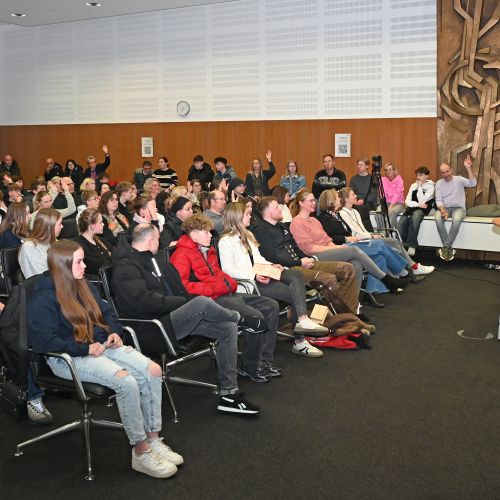 Die Veranstaltung im Großen Sitzungssaal des Steinfurter Kreishauses, Tecklenburger Straße 10, richtete sich an Schülerinnen und Schüler der Abgangs- und Vorabgangsklassen im Kreis Steinfurt sowie ihre Eltern. Der Infoabend wird live über Zoom gestreamt, sodass eine Teilnahme auch von zu Hause aus möglich ist. Etwa 120 Teilnehmende fanden den Weg ins Kreishaus während sich weiter 60 Teilnehmende von zu Hause auzuschalteten.