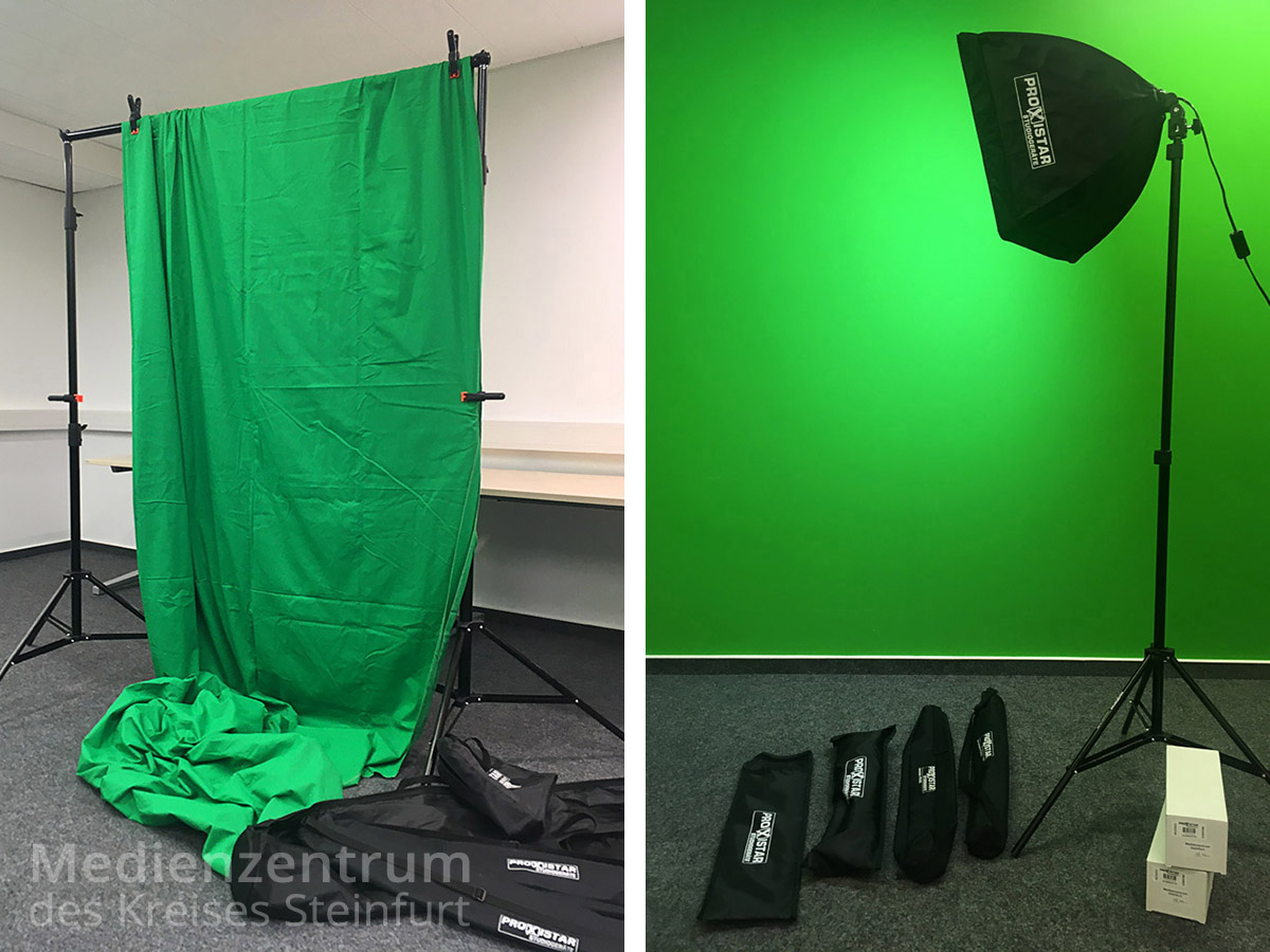Das Teleskop Hintergrundsystem besteht aus zwei hochwertigen Stativen, die bis zu einer Höhe von 2,56m ausgezogen werden können und einen sicheren Stand gewährleisten. Die 2tlg. Teleskop-Querstange lässt sich variabel zwischen 225cm und 400cm ausziehen. Der grüne Chromakey Stoffhintergrund ist 3x6m groß und hat einen Aufhängetunnel, durch den die Querstange hindurchgezogen werden kann. Gestell und Stoff sind jeweils in einer Transporttasche verstaut.