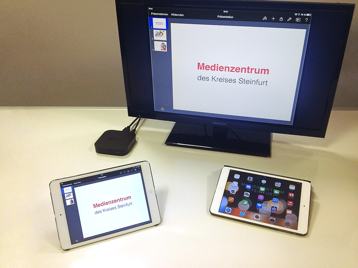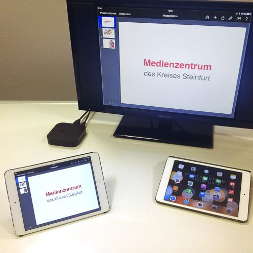 Wir bieten zwei Koffer mit jeweils 8 iPads zum Verleih an. Entleihen können alle schulischen und außerschulischen Bildungseinrichtungen im Kreis Steinfurt. Zu den Koffern gehört auch jeweils eine Apple TV-Box, mit der Fotos, Videos und Präsentationen kabellos auf einen Fernseher, Display oder Beamer übertragen werden können.