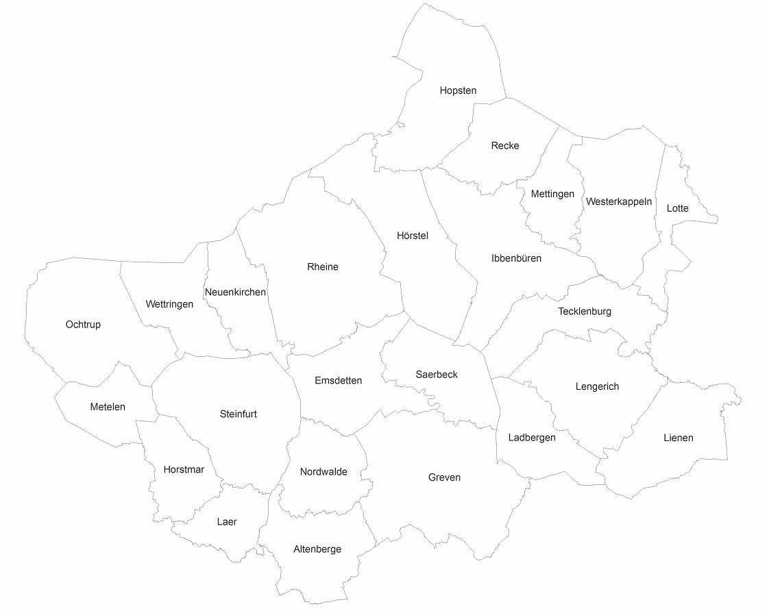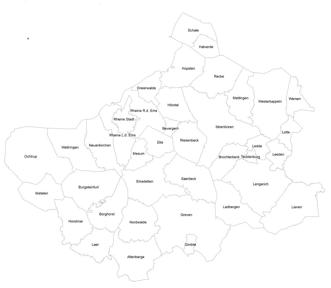 Der Kreis Steinfurt hat eine Fläche von rd. 1796 km², aufgeteilt in 24 Kommunen und 39 Gemarkungen.