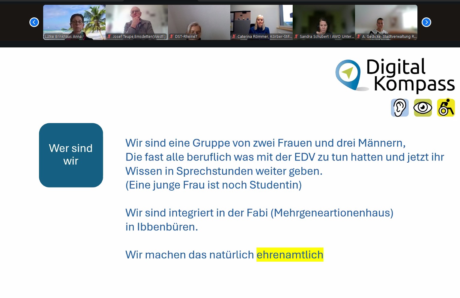 Das Mehrgenerationenhaus Ibbenbüren stellte den Digital Kompass vor: eine Anlaufstelle für alle Fragen rund um die digitale Welt. Dort bieten ehrenamtliche Expert*innen individuelle Beratung und Schulungen zu Smartphone, Tablet und PC an und begleiten die Teilnehmenden direkt beim Umgang mit ihren Geräten.