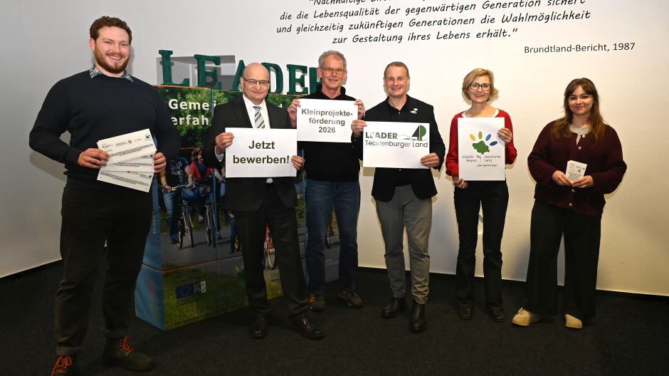 Claas Marienhagen (Regionalmanager LEADER Steinfurter Land), Dr. Martin Sommer (Landrat Kreis Steinfurt und Mitglied im Geschäftsführenden Vorstand der beiden LEADER Vereine), Horst Schöpper (Geschäftsführer der beiden LEADER Vereine), Stefan Streit (Bürgermeister Tecklenburg und 1.Vorsitzender LAG Tecklenburger Land e.V.), Silke Wesselmann (stellv. Geschäftsführerin der beiden LEADER Vereine), Sarina Eßling (Regionalmanagerin LEADER Steinfurter Land) verkünden die Kleinprojekteförderung 2026 (Foto: Dorothea Böing)