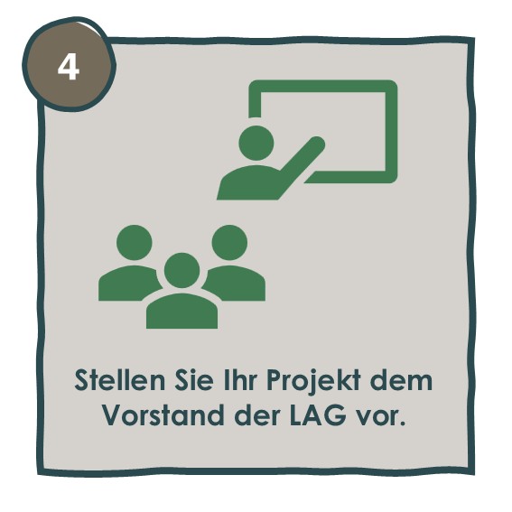 Sie präsentieren Ihr Projekt auf einer Sitzung des erweiterten Vorstandes präsentiert. Der Vorstand erhält die Möglichkeit Fragen zu stellen und trifft danach gemeinschaftlich eine Entscheidung zwecks offizieller Antragsstellung bei der Bezirksregierung.