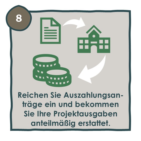 Alle wichtigen Regelungen sind im Zuwendungsbescheid enthalten. Formblätter zwecks Beantragung von Fördermittelauszahlungen sind schon im Zuwendungsbescheid enthalten und können zudem digital vom Regionalmanagement erhalten werden.