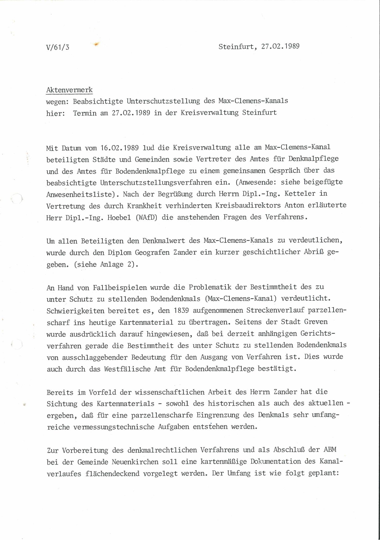 1995 waren die Messarbeiten abgeschlossen und die historischen Akten gesichtet, was den Max-Clemens-Kanal wieder ins öffentliche Gespräch brachte. Es folgten weitere Besprechungen, vor allem mit der Bezirksregierung in Münster, die als Aufsichtsbehörde der Unterschutzstellung letztlich zustimmen muss.