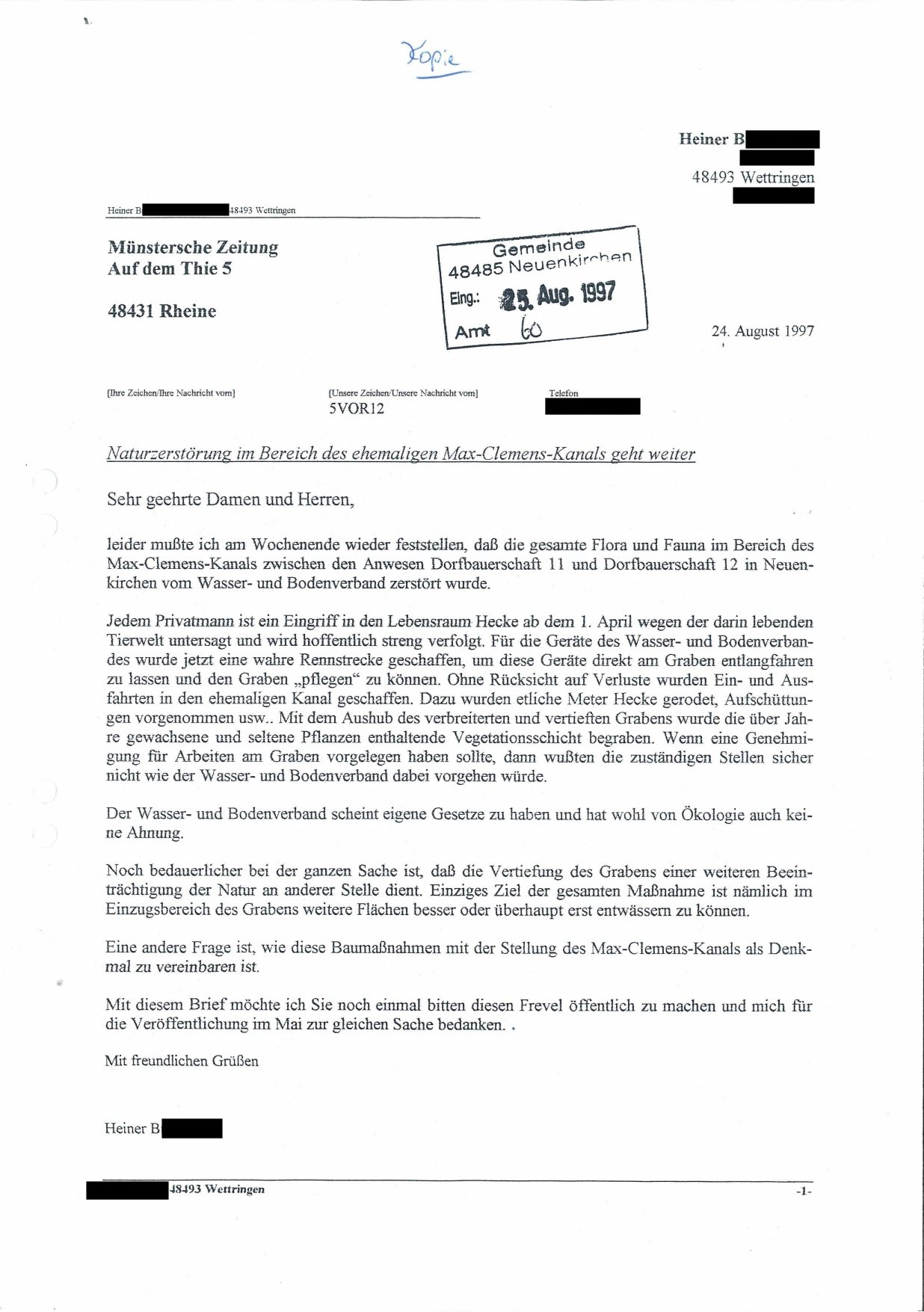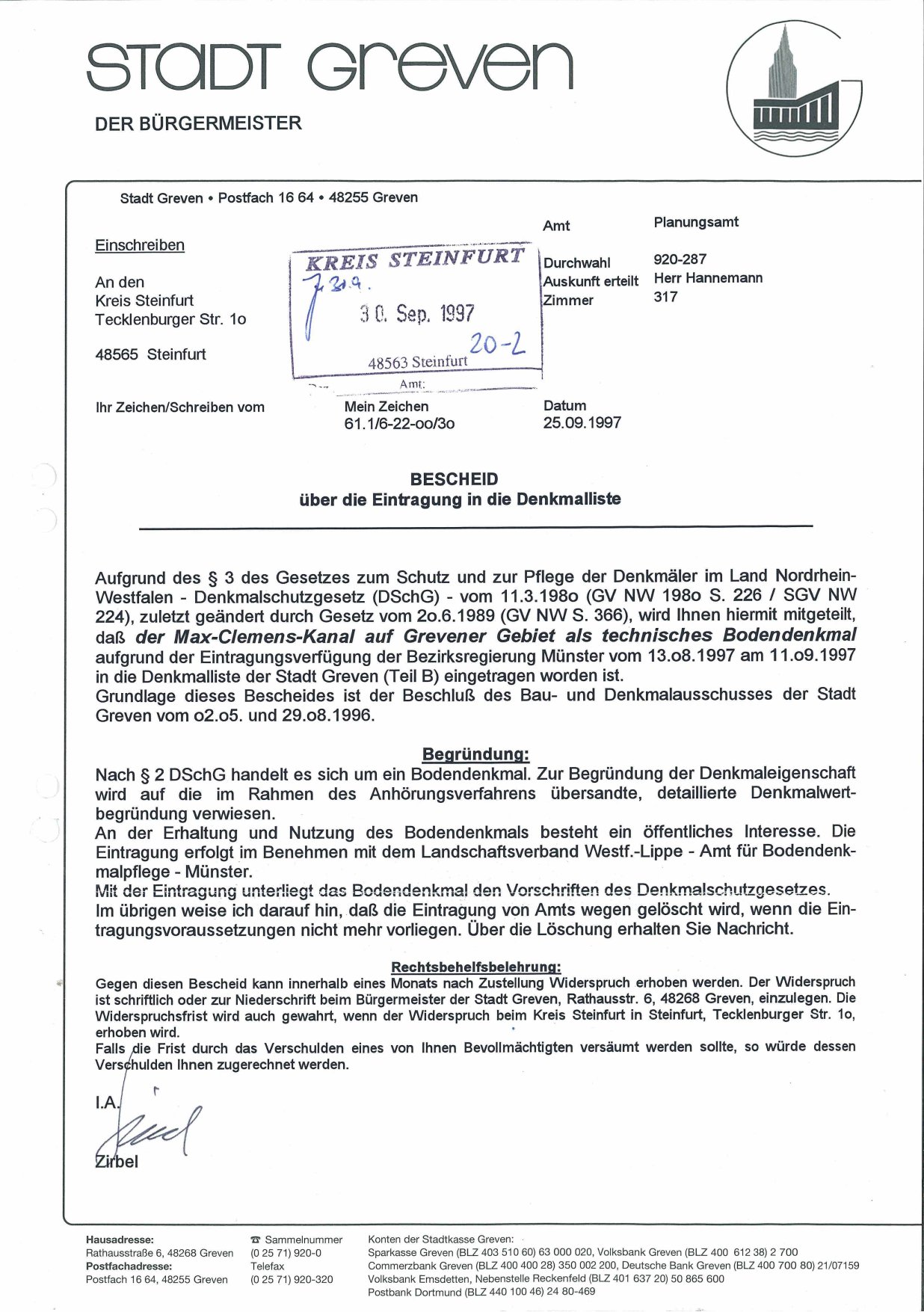 Max-Clemens-Kanals in ihre Denkmalliste einzutragen. Am 22. August 1997 hieß es